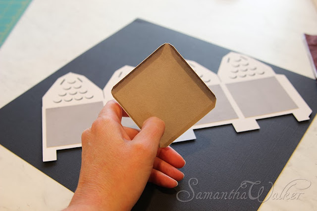 Then glue on the backside of the design, and around the edge, then press on the contrasting "window." Make sure that you have the correct side facing out the window. My box will be a kraft color, with white showing through the windows.